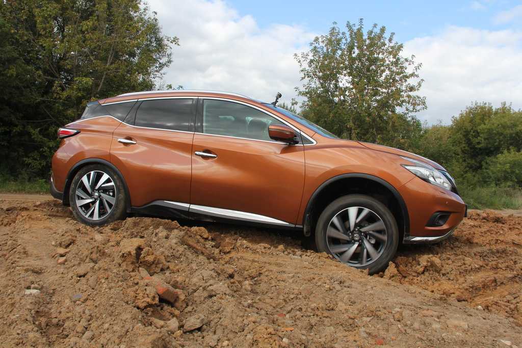 Из интереса пробуем преодолеть короткий отрезок настоящего бездорожья. За счет полного привода Ниссан справляется, но страшновато за глушитель, пластик днища и низкий передний бампер. Да и вариатор при длительных нагрузках «спасибо» не скажет. Так что далеко с твердого покрытия на Мурано лучше не съезжать.