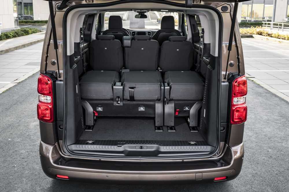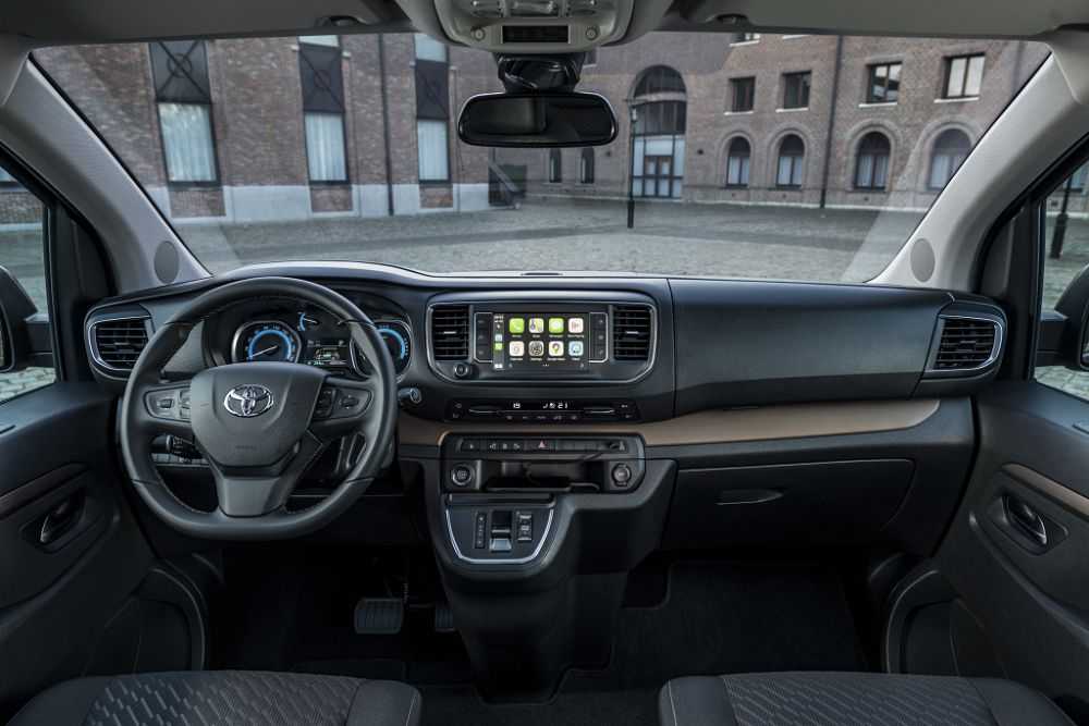Передняя часть Toyota ProAce Verso оформлена так, чтобы не возникало вопросов о принадлежности к марке. Однако здесь проступает прошлый стиль Toyota (к примеру, Camry XV50), хотя более современные модели Toyota выглядят смелее: взгляните на новые поколения Camry, RAV4, Corolla. Отличия в салоне – лишь в наличии логотипа Toyota на руле, да заставках/оформлении ЖК-дисплеев. Все остальное знакомо: передняя панель, приборы и блок «климата», регулируемые сиденья и выдвижные столики, которые можно передвигать по салону как угодно. Автомобиль Toyota ProAce Verso в комплектации Premium доступен в варианте кузова L1 (4,96 м): сзади остается вертикальный багажник объемом 507 л – вроде и немало, но хватит ли этого, чтобы забрать все чемоданы бизнес-делегации из 4-5-6 людей? С другой стороны – предусмотрены такие удобные мелочи, как отдельно открывающееся стекло багажной двери, что упрощает загрузку мелких вещей, сумок, зонтика.