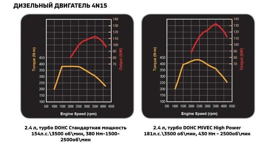 | Тип двигателя | 4N15, рядный, турбодизельный, четырёхлициндровый, непосредственный впрыск, передне-продольное расположение, DOHC, MIVEC, Евро-5 |