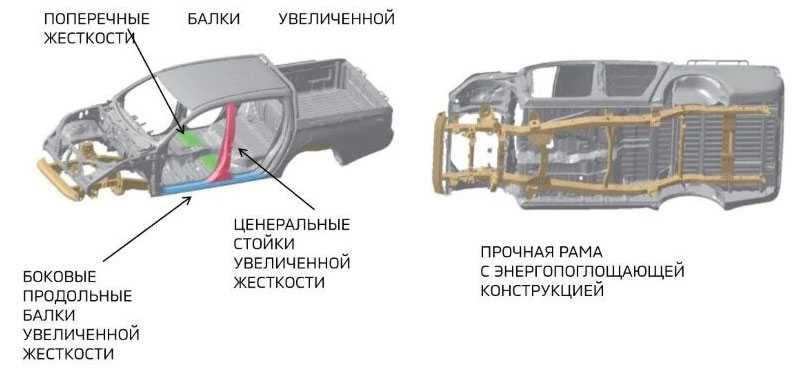 Первое, что отмечено – усилена жесткость кузова. Кузов RISE позволяет эффективно поглощать и рассеивать энергию при столкновении. Жесткость на скручивание у рамы на 7% больше, нежели у прошлого поколения. Более жесткий кузов позволил улучшить управляемость пикапа, улучшить комфорт и снизить посторонние шумы.