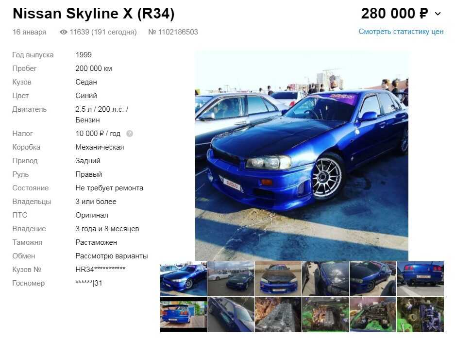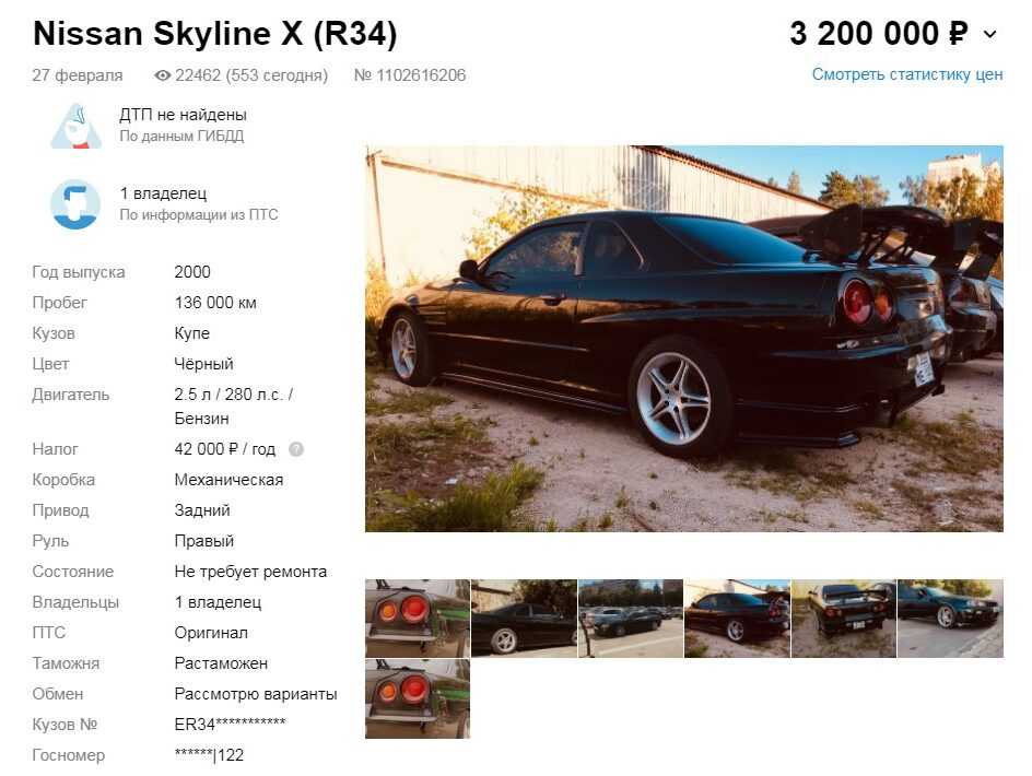 Самая высокая цена на Nissan Skyline R34 на «барахолках» — 3 200 000 рублей (это дороже любого нового автомобиля марки Nissan из доступных в России). Здесь уже тот самый 2,6 на 280 «лошадок» (RB26DETT). механическая коробка передач Getrag, однако привод указан задний, что говорит о том, что либо это не чистокровный GT-R, а некая переделка, или же с годами у него отпал полный привод.