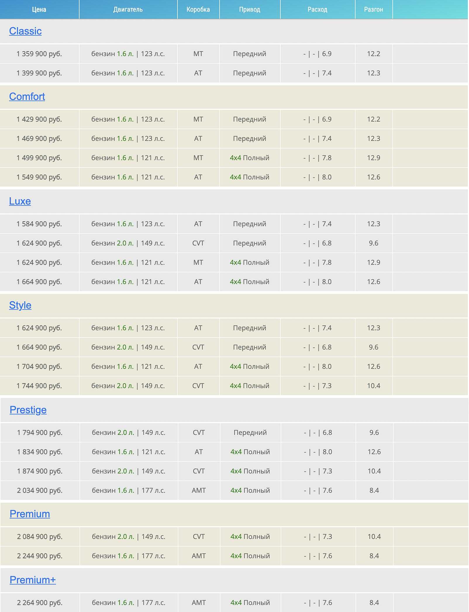 Ходовая часть обеспечивает дорожный просвет в пределах 215 мм, достаточный для движения по глубокой колее. Под капотом устанавливаются рядные 4-цилиндровые бензиновые двигатели объемом 1,6 или 2,0 л, оснащенные механизмом регулировки фаз газораспределения. Стартовая цена в дилерских центрах начинается от 1,572 млн руб.
