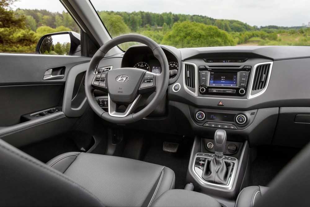 Если же говорить о дизайне интерьера автомобиля Hyundai Creta, то здесь в дорогих комплектациях всё выполнено на достаточно высоком уровне. Интерьер симпатичный, современный и лаконичный. В плане эргономики это практически образцовый автомобиль, но тут прослеживаются характерные черты бюджетного SUV. Среди них недорогие материалы отделки, быстро появляющиеся сверчки, неудачный вариант подсветки приборной панели. Основную роскошь вы получите только в дорогих комплектациях или при покупке отдельных опций. В базе всё откровенно просто.