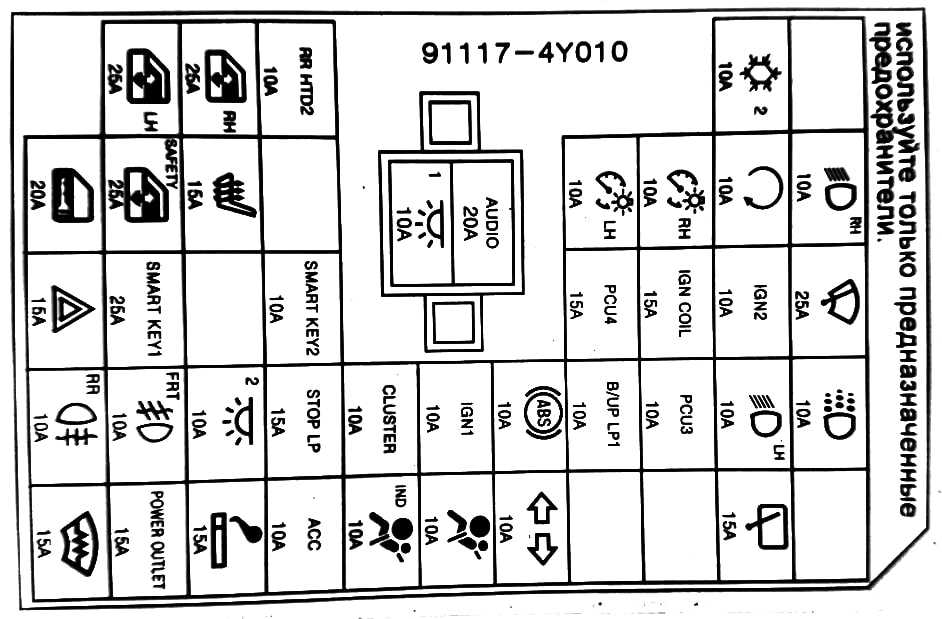 Предохранители моторного отсека Kia Rio 4 поколения также имеют буквенное и символическое обозначение. Назначение буквенного обозначения предохранителей: