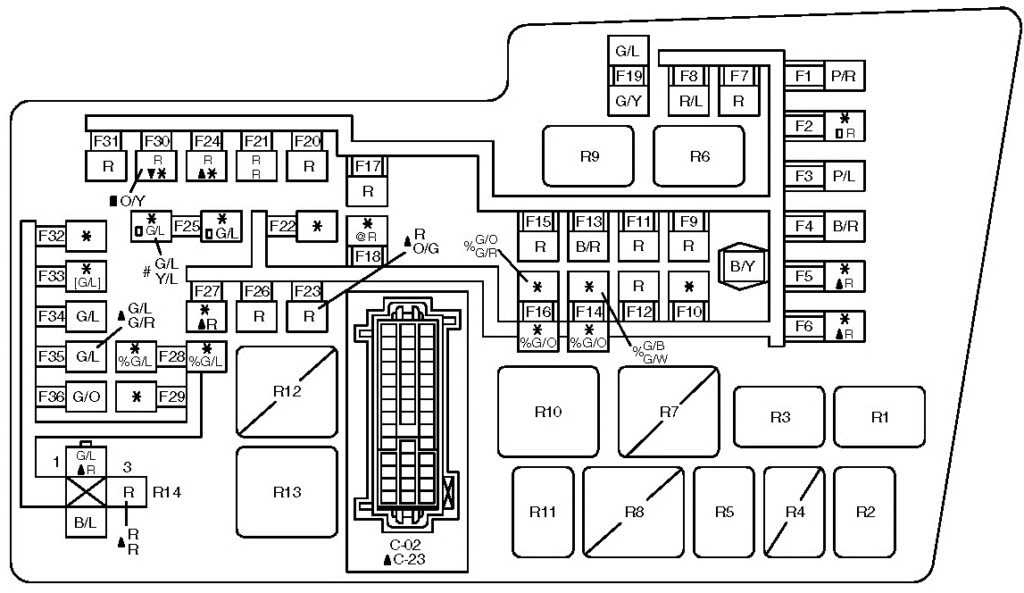 Назначение предохранителей и реле в монтажном блоке, расположенном в салоне