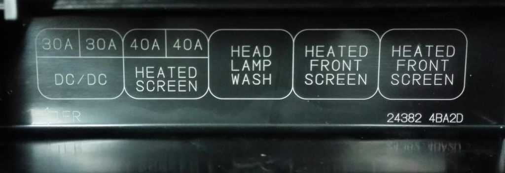 На внутреннюю сторону декоративной крышки нанесена схема расположения и назначение предохранителей.