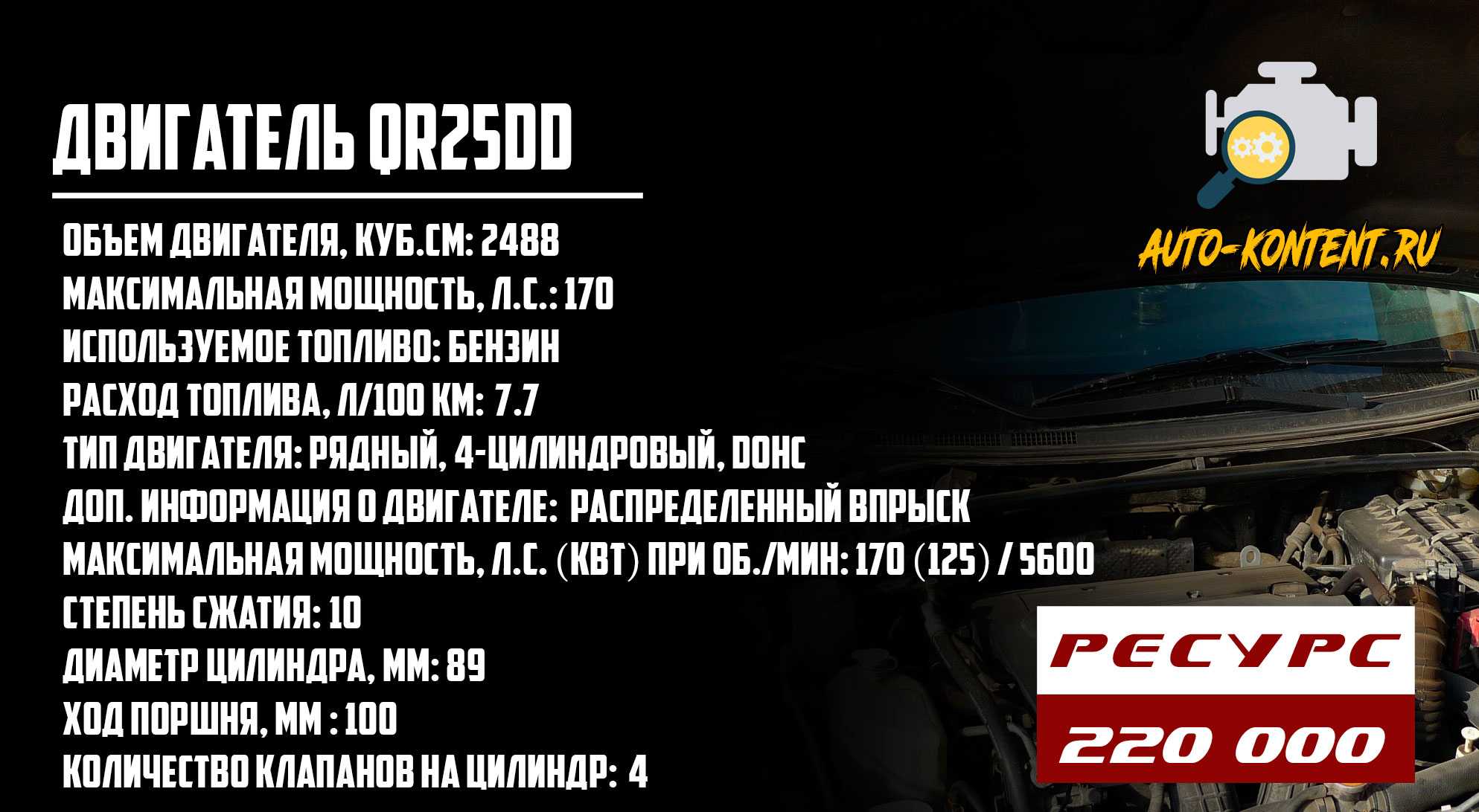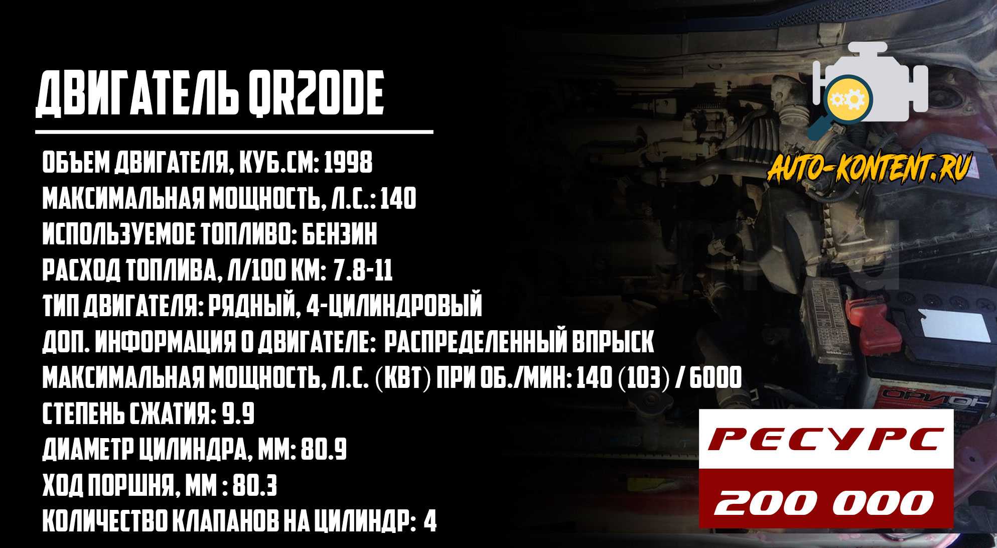 Имеет такой же объем, как и QR20DE, аналогичный ход поршня и показатели цилиндров (диаметр, количество и т.д.). Характеристики: