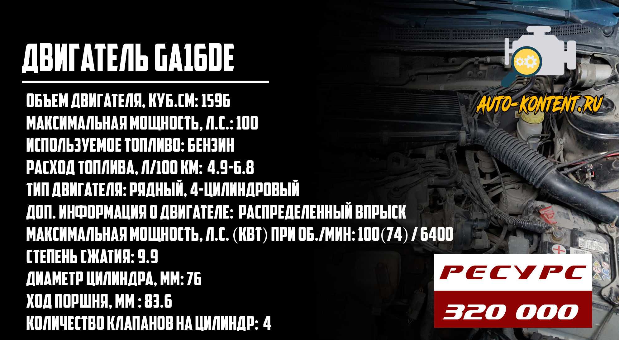 Параллельно с двигателем GA15DE выпускался 1.6-литровый силовой агрегат, получивший несколько другую маркировку – GA16DE. Фактически между моторами 1.5 и 1.6 л всего одно отличие – это увеличенный диаметр цилиндров. Если в двигателе 1.5 л цилиндры расточены под 73.6 мм, то в этом двигателе уже под 76 мм. Использованы новые поршни. Первые версии двигателя были оснащены карбюратором и 12-клапанной головкой блока цилиндров, реже с 8-клапанной ГБЦ. Позже появилась модификация с 16-клапанной алюминиевой головкой блока цилиндров и чугунным 4-цилиндровым блоком. Мощность ДВС составляла 100 лошадиных сил, а крутящий момент 125 Нм. В приводе ГРМ задействованы две цепи с неплохим ресурсом больше 150 тыс. км. Гидрокомпенсаторы отсутствуют, как и фазорегулятор. Из особенностей мотора – наличие ECCS.