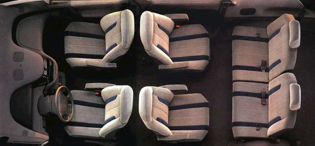 Для начала нужно пояснить: мотор у Toyota Estima находился в пределах базы вовсе не для того, чтобы обеспечить машине спортивную управляемость. Главный конструктор Токуо Фукуичи преследовал сугубо утилитарную цель — по максимуму увеличить пассажирское помещение, сохранив общую длину автомобиля в пределах 5 метров. Надо сказать это у него получилось. Салон Estima получился довольно просторным и без труда вмещал семь человек, включая водителя (позднее появилась версия на восемь мест). Дополнительное удобство пассажиров обеспечивали поворачивающиеся сидения среднего ряда и ровный пол. Все эти достоинства реализовывались за счет серьезного усложнения компоновки.