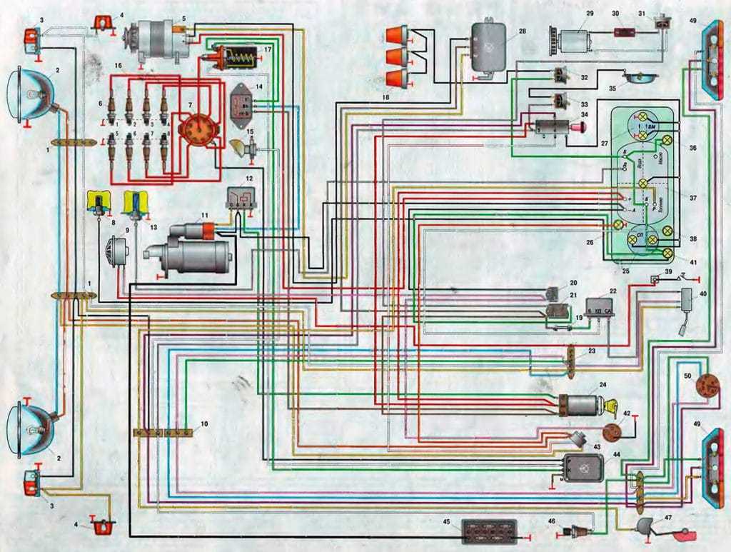 1, 10, 23 и 48 – соединительные панели; 2 – фара; 3 – передний фонарь; 4 – боковой повторитель указателя поворота; 5 – генератор; 6 – свеча зажигания с помехоподавляющим резистором; 7 – датчик-распределитель; 8 – датчик сигнализатор аварийного перегрева жидкости; 9 – электрический сигнал; 11 – стартер; 12 – реле стартера; 13 – датчик температуры охлаждающей жидкости; 14 – добавочный резистор катушки зажигания; 15 – подкапотная лампа; 16 – высоковольтные провода; 17 – катушка зажигания; 18 – опознавательные фонари автопоезда; 19 – плавкий предохранитель; 20 – биметаллический предохранитель; 21 – блок биметаллических предохранителей; 22 – реле – прерыватель указателей поворота; 24 – выключатель зажигания и стартера; 25 – спидометр; 26 – сигнализатор дальнего света фар; 27 – манометр тормозной системы; 28 – регулятор напряжения; 29 – электродвигатель отопителя; 30 – резистор электродвигателя отопителя; 31 – переключатель отопителя; 32 – выключатель опознавательных фонарей автопоезда; 33 – выключатель плафона; 34 – центральный переключатель света; 35 – плафон; 36 – сигнализатор аварийного падения давления масла; 37 – комбинация приборов; 38 – сигнализатор указателей поворота; 39 – контактные устройства звукового сигнала; 40 – переключатель указателей поворота; 41 – сигнализатор аварийного перегрева жидкости; 42 – розетка переносной лампы; 43 – ножной переключатель света фар; 44 – транзисторный коммутатор; 45 – аккумуляторная батарея; 46 – выключатель сигнала торможения; 47 – датчик указателя уровня топлива; 49 – задний фонарь; 50 – штепсельная розетка прицепа.