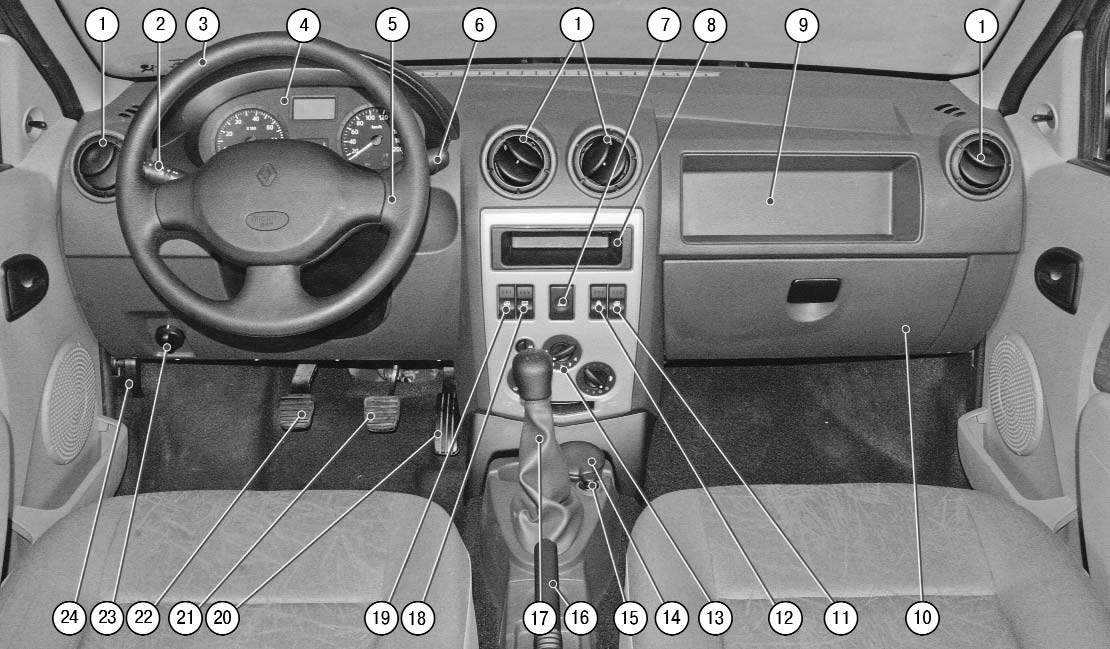 Приборная панель Logan отличается минимализмом и функциональностью, поэтому список выводимой информации относительно небольшой. Для удобства каждый элемент на картинке пронумерован.