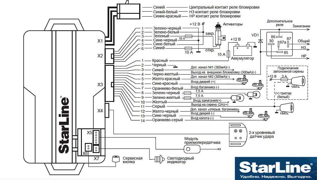 - инструкция по эксплуатации А8 , напечатана на русском языке, к которой также прилагается детальная схема подключения сигнализации;